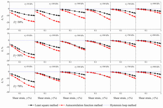For Dr = 30% and σc = 50 kPa, the relative difference for the two determination methods increases with increasing shear strain, with the maximum δ of about 20% for the autocorrelation function method and about 10% for the least square method. As σc increases, the relative difference appears to decrease. This follows the same trend observed for the G shown in Figure 8. For σc = 900 kPa, the percentage changes at γ = 1% of two determination methods decrease to around 5%. In addition, similar trends are captured for the cases of Dr = 50% and 70%. Compared to σc, Dr is found to be the second factor that affects the uncertainties introduced by different determination methods.