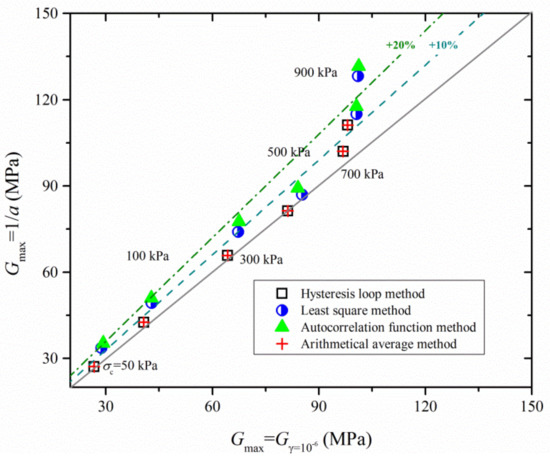 Figure 13 shows the comparison of the calculated Gmax for the four G determination methods. As can be observed, the Gmax calculated by 1/a is larger than that of Gγ=10−6. For instance, the autocorrelation function method predicts the maximum Gmax, with a relative difference of more than 20% for σc = 900 kPa. The hysteresis loop method and arithmetical average method compute the same value of Gmax, but slightly smaller than that of the least square method, with the relative difference generally around 10%. Nevertheless, two definitions of Gmax capture the same trend in terms of the influence of four determination methods. This phenomenon is in agreement with the findings shown in Figure 8.