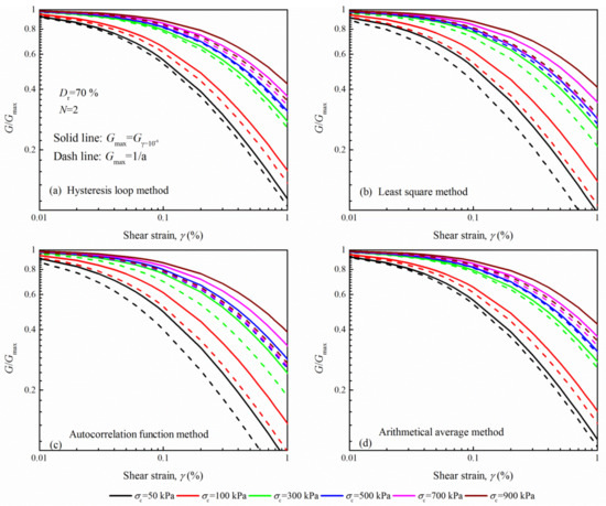 - The arithmetical average method predicts almost identical results with the hysteresis loop method. Nevertheless, the larger G estimated at medium strains and the smaller G estimated at large strains for the autocorrelation function method, and least square method results in a steeper gradient of the G/Gmax curve. This thus corresponds to a smaller reference strain for these two methods.