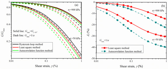 The previous discussion has clearly illustrated that the G/Gmax curves obtained using the autocorrelation function method and the least square method are generally low when G is normalized by Gγ=10−6. This phenomenon is also observed when Gmax is calculated using 1/a, as shown in Figure 15a. As noted in Figure 15a, for the same G determination method, a significant difference in the G/Gmax appears for two definitions of Gmax. For instance, when Gmax is calculated by 1/a, the G/Gmax determined by the autocorrelation function method is typically 30~40% lower than that of the hysteresis loop method in the strain range of 10−3~10−2 at σc = 50 kPa (Figure 15b) while the percentage change is 20~25% for the Gγ=10−6 case, as depicted in Figure 12. From Figure 15b, the decreased relative difference with increasing effective confining pressure can be observed. Additionally, the relative difference will further increase when both the uncertainties associated with the G determination methods and definitions of Gmax are considered. For instance, for σc = 900 kPa, the relative difference of G/Gmax between the autocorrelation function method with Gmax = 1/a (i.e., green dash line, Figure 15a) and the hysteresis loop method with Gmax = Gγ=10−6 (i.e., black solid line, Figure 15a) can be up to around 50% at γ = 10−2.