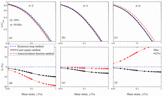 Therefore, the aforementioned means that the autocorrelation function method discards the influence of N on both G and G/Gmax. As an example, Figure 16 compares the G/Gmax results of N = 2, 3, and 4 for various determination methods, corresponding to Dr = 30% and σc = 50 kPa. It can be observed that the autocorrelation function method predicts identical G/Gmax curves, and illustrates the average result of the five hysteresis loops. Both the hysteresis loop method and the least square method indicate an increased non-linearity for high N. This leads to the G/Gmax curves of these two methods which are on the top for N = 2 whereas these two curves move to the downsides for N = 4. Additionally, Figure 16 further demonstrates the influence of N on the uncertainty quantification of determination methods, particularly in the large strain range. For instance, the percentage change of the least square method tends to decrease with increasing N, with a maximum δ of around 5% for N = 4.