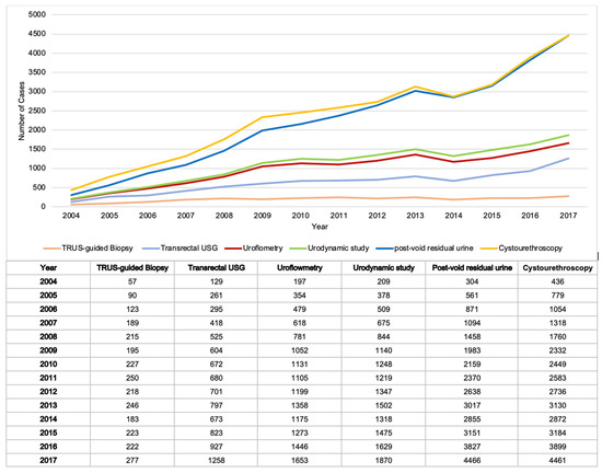 Post-void residual urine and cystourethroscopy were among the diagnostic tools with the greatest increases over the study period, with post-void residual measurements increasing from 304 cases in 2004 to 4466 in 2007 and cystourethroscopy increasing from 436 cases in 2004 to 4461 in 2007. On the contrary, TRUS-guided biopsy was the procedure with the smallest amount of increase, going from 57 cases in 2004 to 277 in 2007.