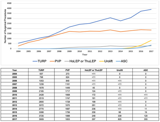 However, these newer modalities, in many cases, may be far more expensive than traditional TURP, and there are few contemporary studies that analyze and compare these costs [10]. Moreover, we have few data regarding the total overall costs incurred from the BPH workup utilized to confirm the need for surgical treatment. Therefore, the aim of our study is to present the annual rates of BPH surgery and to analyze recent trends in the utilization of newer surgical modalities and any changes in medical costs related to these treatments over a 15-year period in the U.S.
