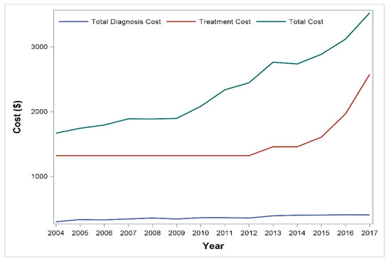 The total number of BPH diagnosis was 44,820, and the median cost for each procedure was USD 1459, USD 1875, USD 1419, USD 3284, and USD 3590 for TURP, PVP, HOLEP/ThULEP, Urolift, and ASC, respectively. The median overall cost was USD 2471. With regard to the costs of treating BPH surgically, the diagnostic and treatment costs demonstrate annual increases, as shown in Table 4, with the slope of costs becoming steeper in the last 4 years (Figure 3).