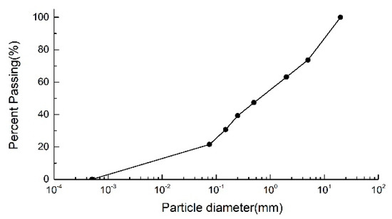 A high proportion of fine sands can be found in local areas, and the average percentage of fines content smaller than 0.075 mm is 19% as shown in Figure 1. The layer has an average natural density of 1.65 g/cm3. The SPT value ranges from 0 to 18, with a mean value being 7, and the design relative density is 50%. The design permeability is 6.4 × 10−2 cm/s.