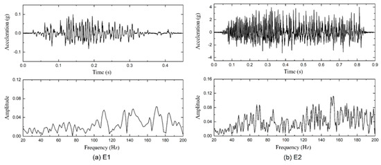 Noted that the input motions of acceleration time histories must be scaled conforming to the scaling law. As indicated in Table 2, the time scaling factor is 1/67.3 (model/prototype, the same below), and the acceleration scaling factor is 40. Taking the actual input motions E1, E2, and E3 with a peak acceleration of 0.1 g as examples, the acceleration time histories and Fourier spectrums are shown in Figure 5. The durations of E1−1, E2−1, and E3−1 are 0.44 s, 0.89 s, and 0.89 s, respectively, and the Arias Intensity is 5.34 m/s, 16.1 m/s, and 19.74 m/s, respectively.
