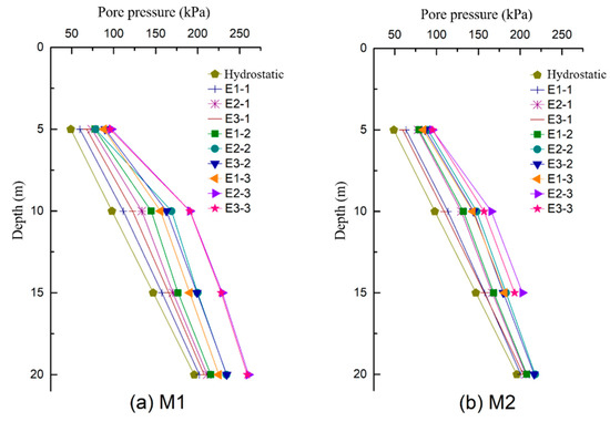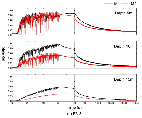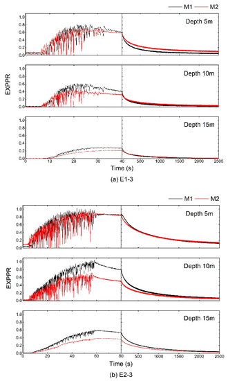 Further analysis is made on the EXPPR time histories during strong earthquakes. And the time histories of EXPPR at depths of 5 m, 10 m, and 15 m during the earthquakes of E1−3, E2−3, and E3−3 is plotted for both M1 and M2, which is shown in Figure 8.