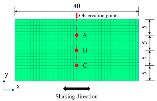 The 2D FE model of the saturated calcareous sand with relative density of 50% was established and analyzed. As shown in Figure 9, the dimensions of the FE model are 20 m × 40 m (height and width), the height of which is consistent with that of the centrifuge model. The sand material is modeled by QuadUP elements [48] following the - dynamic consolidation equation, and the thickness of elements is 1 m. According to the laboratory test results, the permeability of sand materials is set to be 6.4 × 10−2 cm/s. The boundary conditions are set as follows: (1) the displacement of nodes in left and right boundaries sharing the same elevation are forced to be equal in -direction and -direction; (2) The nodes at the base are fixed, and the input seismic loading is imposed on the base along the -direction; (3) The pore pressure on the soil surface is fixed to be zero, and other boundaries are impervious. The earthquake E2 in the centrifuge tests are selected as the input seismic loading, and the peak acceleration is linearly scaled to 0.1 g, 0.2 g, and 0.3 g.