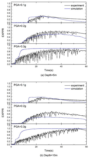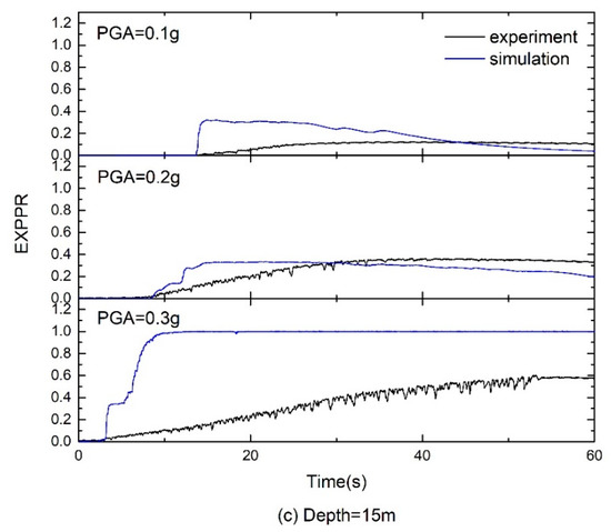 With regard to the numerical results, it can be seen that with the increase of the peak acceleration of the input ground motion, the EXPPRs at all the depths reach up to a higher maximum value with faster accumulation and slower dissipation. Under the earthquake with peak acceleration of 0.3 g, the EXPPRs at all the observation points reach 1.0 after about 9 s, even for point C located at 15 m depth, implying a high risk of liquefaction for the simulated site. Moreover, the EXPPRs remain in a high platform and do not dissipate during the loading of the earthquake. The earthquakes with peak acceleration of 0.1 g and 0.2 g both result in EXPPRs at different depths lower than 0.6, indicating that the liquefaction potential of the site is relatively low.