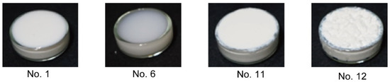 The scattering properties of the scattering medium with particles vary not only with the constituents but also with the manufacturing process [14,15,18]. Among them, it is known that even with the same constituents, changes in the stirring speed can also change the scattering properties, along with changes in the particle size distribution. In this study, as shown in Table 1 and Table 2, samples with variations in scattering properties were prepared using two types of particles (titanium dioxide and zinc oxide) and changing the stirring speed while keeping the other constituents the same. By changing the stirring speed 5 to 40 m/s (refer to Table 1) of the two particle types in five different ways, 10 different samples were prepared. In addition, the samples with high scattering coefficients containing a large number of particles or nearly the limit of particles just before becoming lumps with a paste-like formation were prepared, as shown in Table 3 and Table 4. The prepared samples were stirred slowly several times with a stick before transferring them to the containers for sensory testing and scattering coefficient measurements. During this process, we confirmed that there was no change in the dispersion state of the sample, such as precipitation. A photograph of a sample created through these processes is shown in Figure 1.