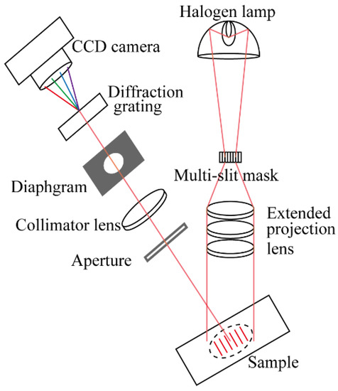 An instrument developed in our previous work [19,20] was used to measure the optical properties, and it can non-invasively measure the optical properties of semi-transparency materials. This measurement instrument utilizes the Reflection Spatial Profile Method (RSPM), and a schematic diagram of the instrument is shown in Figure 2. Structured light is irradiated onto the measurement sample, and the spatial profile of the reflected light is measured by a cooled charge-coupled device (CCD) camera. Since the spatial profile of the reflected light is dependent on the optical properties of the sample, the principle is that the absorption and scattering coefficients can be measured by inverse analysis.