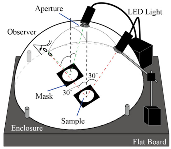Figure 3 shows the experimental setup for visual perception. In the system, to restrict panelists’ view, a dome/sphere-like isolation system was constructed for sample viewing. With such a system, the panelists can view only the samples to be tested inside the dome thus eliminating the disturbance from outside. The dome was constructed with a styrofoam hemisphere (diameter is 50 cm) whose inside was painted with black paint (JSC-3, JAPANSENSOR Corporation, Minato-ku, Tokyo, Japan). Light from a double-arm LED light source (LED-W60, ARMS system Co., Ltd., Setagaya-ku, Tokyo, Japan) with the same light intensity was used to illuminate the samples to be compared at an angle of 30 degrees and the reflected light from the samples was adjusted to reach the panelist viewing through a hole made in the dome. To make the point light source, an aperture (aperture diameter is 1 mm) was placed immediately after the light source. The panelist was instructed to look only at the sample while minimizing the external disturbances from all the other surroundings influencing the view. Panelists were asked to report the result of the comparison of the samples orally.