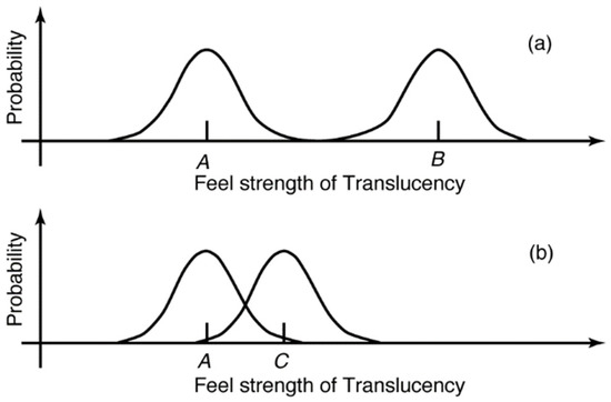 First, suppose that the intensity of luster and translucency can be expressed in terms of some scaled value. For example, let A be the scale value of translucency of an object. Since each person perceives translucency differently, the translucency values that people perceive will be distributed within a certain range. This situation is shown in Figure 4. If two samples are compared in which the translucency values A and B are far apart (as shown in Figure 4a, the distributions do not overlap), all panelists judge that the sample with the value B is more translucent. Conversely, for a pair of samples with translucency values A and C close to each other (the panelists whose distributions overlap (Figure 4b), a case appears in which the strength of translucency differs from person to person. For example, 7 out of 10 respondents would respond that the sample with a value of C is more translucent than with a value of A, while the remaining 3 respondents would respond that the sample with a value of A is more transparent than with a value of C. Of course, the numerical value of translucency of an object is not known at the sensory evaluation stage. For example, suppose 10 panelists are shown a pair of samples and asked which is more translucent. The results are scored and summarized as follows: if one (e.g., B) is more translucent than the other (e.g., C), the score is 1 point; otherwise, the score is 0. If no judgment can be made, the score is 0.5 for both. In this case, 10 points are given for A and 7 points for B as in Figure 4a. If this comparison is made for all sample combinations and the scores are obtained, a statistical process can be used to determine the relative relationship of all samples, i.e., the scale value of the visual perception of the samples.