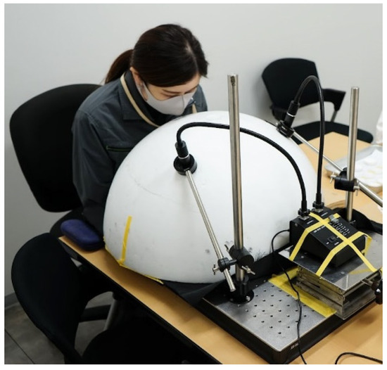 Using the experimental system shown in Figure 3, the panelists were asked to look at or fixate on the two samples placed inside the dome simultaneously while sitting on a chair, as shown in Figure 5. The panelists were asked to compare the two samples and report on the following question: choosing whether they felt a stronger glossiness (or translucency) in the left or the right sample, or whether there was no difference between the two samples. Thurston’s statistical calculation was performed with 1 point for the selected sample and 0.5 points for both if no difference was felt. A total of 66 comparative observations were carried out, where all combinations using a total of 12 samples are presented in Section 2 (C(12, 2) = 66). As the study involves perception of glossiness and translucency, each panelist was asked to carry out only one, either glossiness or translucency. This was carried out to avoid any one perception of the same sample unconsciously affecting the other perception of the panelist.