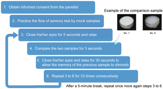 - After completing step 6 following a 5-min break, steps 3 to 6 were repeated to complete the observation of a total of 66 sets of samples. Since a total of 66 sets of samples are conducted at one time, panelists may become too fatigued to concentrate on the sensory test in the latter half of the test, so the test was divided into half sets with a break in between.