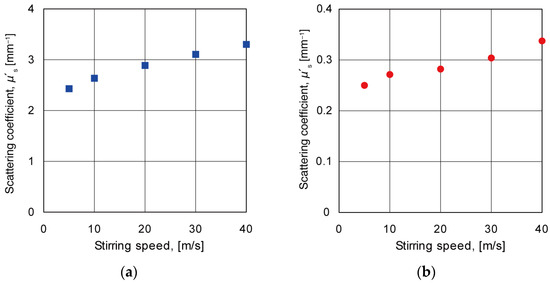 These results showed that the scattering coefficient increased for both particle samples as the stirrer speed was increased. This was consistent with the results of experiments conducted in our previous study [14]. Particles in a sample have a structure that consists of not only the original particle size of the particle material (primary particle size), but also agglomerated particles of a different size (secondary particle size). Increasing the stirring speed has the effect of making the agglomerated secondary particles finer, leading to an increase in the probability density of the primary particle size and an increase in the scattering coefficient of the sample. Therefore, Figure 7 revealed that the same effect occurs even if the particles are made of different materials and have different values of scattering coefficients.