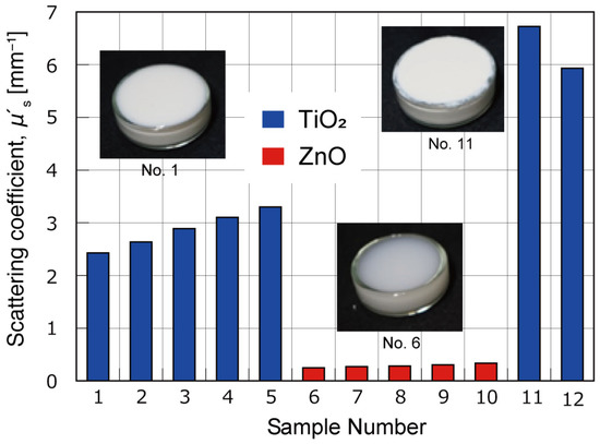 The results for translucency showed that the lower the scattering coefficient, the more translucent samples tended to be when viewed as three groups with different scattering coefficients. As mentioned earlier, a comparison of the zinc oxide sample group with a small scattering coefficient (Nos. 6–10) and the high scattering coefficient group with different components (Nos. 11–12) showed a difference of approximately 2σ, which is a sufficiently significant difference.