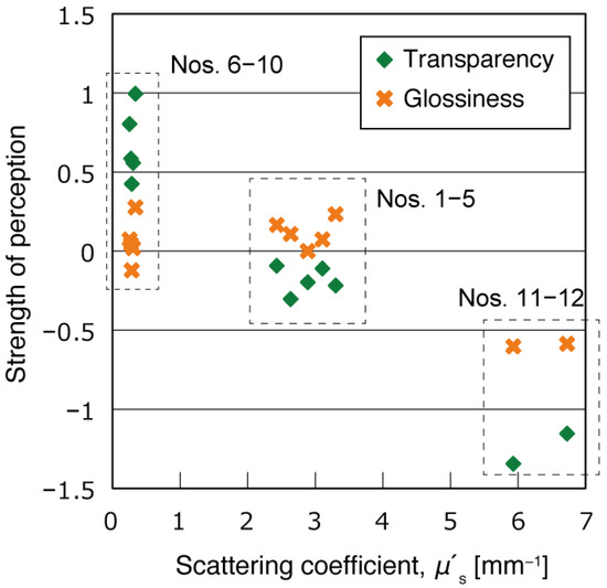 Next, we discuss the glossiness in the same way. Comparisons between group Nos. 1–5 and Nos. 6–10, which showed differences in translucency, showed that there was only a difference within 0.5σ, both between groups and within each group. In terms of glossiness, there was no clear difference in the trend. In addition, a comparison between the group of samples with the largest difference in scattering coefficients (Nos. 11–12) and the other samples showed that the difference was only about 0.8σ, even when the largest difference was obtained. In other words, although there is no clear and significant difference between the samples with the number Nos. 11–12 group and the others, it can be considered that the higher the scattering coefficient, the harder it is to feel the glossiness, but the difference is very small.