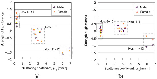Both the translucency in Figure 10a and the glossiness in Figure 10b show the same trend as in the comparison mentioned above in Figure 9, indicating that the data plotted in the graphs for males and females are very close in value. In other words, there is not much difference between the ratings of these two visual perceptions for males and females. However, only in the glossiness of males, the group of Nos. 11–12 with large scattering coefficients took values at least 1σ apart from the others, indicating a clear difference.