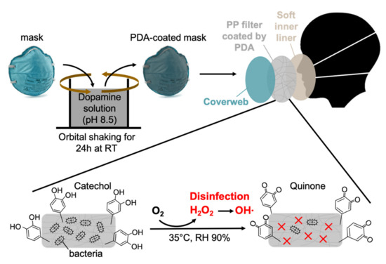 Polydopamine, inspired by the adhesion mechanism of marine mussels, is a thin multifunctional coating material that can be introduced into any kind of substrate [14,15,16,17,18,19], including polypropylene [20]. The inherent catechol functionality of polydopamine allows various chemical conjugations, such as hydrogen bonding, π-π stacking, metal coordination, and other covalent bonds [21], and is the origin of material-independent coating ability. Moreover, the catechol group has a high potential for transformation into H2O2 [22,23], which then generates hydroxyl radicals (OH·) [24] via a chemical oxidation process. Reactive oxygen species (ROS) oxidize the crucial components of pathogens, resulting in disinfection [25]. Thus, we postulate that successive polydopamine coatings may be a way of permanently producing H2O2. This is beneficial for avoiding the spontaneous growth of pathogens in the mask, enabling the reuse of masks without structural deformation of the filtering materials.