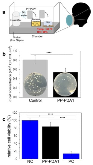 Mimicking the practical conditions in masks is essential for achieving reliable antibacterial activity of the PDA-coated PP filter. According to a previous report [2], we performed all relevant experiments, including bacterial inoculation and H2O2 production experiments, in a specialized chamber, maintaining a humidity of 90% at a constant temperature of 35 °C (Figure 3a). For the bacterial growth experiment, PP-PDA1 was dipped into E. coli solution with a concentration of 3–8 × 109 colony-forming units (CFU)/mL. The concentration of E. coli was calculated after 9 h of incubation (see Supplementary Materials for the detailed procedures). The bacterial level decreased significantly in PP-PDA1 (0.54 × 109 ± 0.08 CFU/mL·cm2, n = 5) compared to the initial bacterial concentration in the control sample (bare PP, 0.81 × 109 ± 0.09 CFU/mL·cm2, n = 15).
