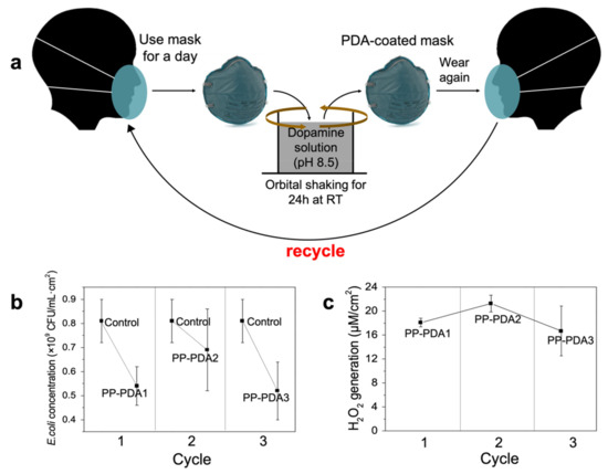 H2O2 production in PDA is not permanent and has a saturation point [26]. The advantage of the developed system is that the H2O2 source (catechols) can be easily refilled by additional PDA dip-coating cycles. Thus, the antibacterial activity of the mask can be maintained by continuous PDA coatings, which are virtually unlimited, as illustrated in Figure 4a. To test this hypothesis, additional bacterial growth experiments were performed by utilizing PDA-coated PP meshes with 1, 2, and 3 coating cycles, and the corresponding samples are designated as PP-PDA1, PP-PDA2, and PP-PDA3, respectively (Figure 4b). The bacterial concentration in each substrate after 9 h of incubation was similarly diminished from 0.81 × 109 ± 0.09 CFU/mL·cm2 (control, n = 15) to 0.54 × 109 ± 0.08 CFU/mL·cm2 (n = 5, PP-PDA1), 0.69 × 109 ± 0.17 CFU/mL·cm2 (n = 5, PP-PDA2), and 0.52 × 109 ± 0.12 CFU/mL·cm2 (n = 5, PP-PDA3), respectively. Thus, the antibacterial ability can be constantly sustained in every single substrate regardless of the coating cycles, demonstrating antibacterial recyclability.