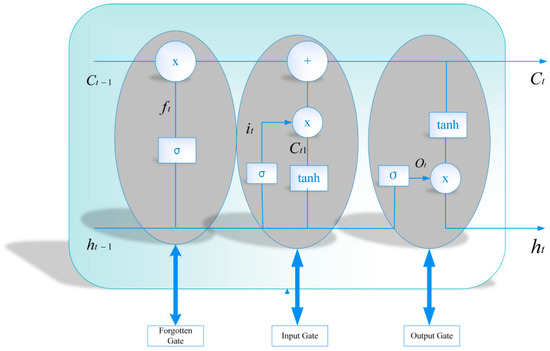 where ,, and represent the forget gate, input gate, and output gate, respectively; denotes the weight, represents the bias term, refers to the input of the previous unit, denotes the state of the previous memory unit, and represents the sigmoid function.