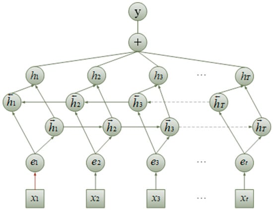 During the processing of historical data, the single-layer LSTM model evaluates the prediction of the succeeding instance. Accordingly, the output value is related only to the information of the previous instance. In the actual traffic information, the target value to be predicted is not only related to the information of the previous instance, but also influenced by that of the future instance. Therefore, we executed the BILSTM model for prediction. The BILSTM structure comprises two unidirectional LSTM, stacked up and down. The input at time t is predicted based on the forward and reverse propagation, and the output is jointly determined by the two LSTMs [31], which improves the stability of the network during the processing of the short-term traffic flow time series in both directions. The structure diagram is illustrated in Figure 2.