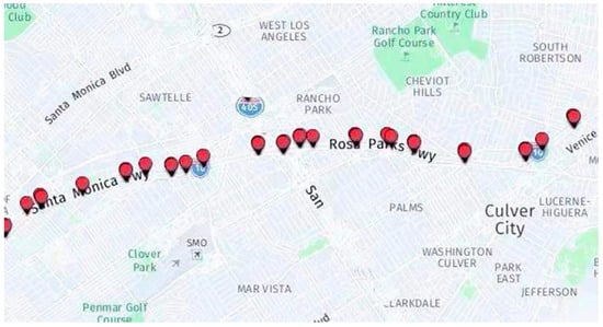 To test and verify the effect of the model advanced in this study, we employed the dataset provided by PEMS, which is a public highway database in California, USA, for training evaluation. The database contains real-time and historical data of a total of 47,000 detection points in California. Among which, 15 detection points in the I10-E7 area of the highway in Los Angeles, California were chosen as the research targets, and the corresponding positions are presented in Figure 4. In particular, the data from May 1 to July 31, 2021 were regarded as the experimental data. The data were recorded in intervals of 5 min, producing a total of 288 × 92 × 15 × 2 pieces of sample data. The flow data of the last 1000 samples are displayed on the left-hand side of Figure 5, and the traffic flow chart from June 7 to June 11, 2021 is presented on the right-hand side. As observed, the characteristics of the traffic flow were strongly periodic, and the total traffic flow data described a similar trend.