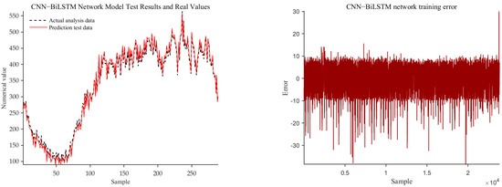 The proposed model structure was trained on the experimental environment and parameter setting adopted in the experiment, as discussed in Section 4. The traffic flow and speed data were inputted into the CNN to pick up the spatial characteristics, and BILSTM was inputted to pick up the temporal characteristics. The predicted results are presented on the left-hand side of Figure 6. As observed from the figure, the actual traffic flow value fitted appropriately with the predicted value, and the overall flow trend was consistent with an evident prediction effect. Comparatively, the prediction error is charted on the right-hand side of the figure, which indicates an extremely small predicted flow error, which completely proves the accuracy and feasibility of the proposed model.