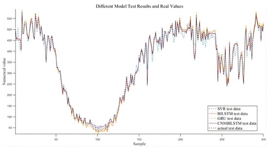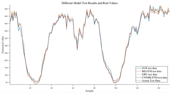 Similarly, the results presented in the following Table 1 indicate that the SVR model produced the largest error in all predictions, because the SVR uses a kernel function to map numerous uncertain traffic flow data into high-dimensional space, and, consequently, fails to completely utilize the spatial and periodic characteristics for traffic prediction, thereby resulting in poor prediction performance. Upon considering the 5 min interval as a reference, the MAE, MAPE, RMSE, and other indicators were reduced by 47.5%, 36.2%, and 47.2%, respectively. Compared to the SVR model, the GRU model more appropriately reflects the periodicity of traffic flow by predicting the time series of traffic flow. However, the GRU model is effective only in capturing the short-term characteristics of traffic flow and fails to capture the long-term features. Therefore, we introduced the BILSTM model to store additional information by forward and reverse information propagation through the bidirectional LSTM model in order to achieve the effect of long-term temporal feature sequences and improve the stability of the model. Compared to the GRU model, the BILSTM model reduced the performance indices of MAE, MAPE, and RMSE by 15%, 29.5%, and 10.6%, respectively. Both the GRU and BILSTM models provided predictions based on the time series characteristics of traffic flow, but they could not reflect the spatial characteristics of traffic flow. Therefore, in this paper, we propose the combined CNN-BILSTM model. As evaluated from the following Table 1, the CNN-BILSTM model was further superior in performance indicators, which were 30.4%, 32.2%, and 39.6% greater than the BILSTM model, respectively.
