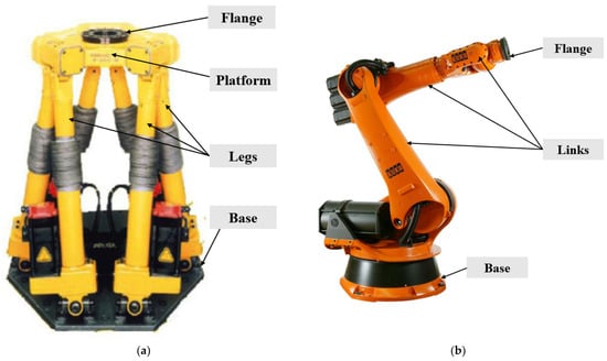 Since precision has improved and manufacturing costs have decreased, robots have been widely adopted in different industrial fields. Compared to computer numerical control (CNC) machine tools, industrial robots have a low cost, high flexibility, and large workspace, and they have gradually become popular in the manufacturing industry. An industrial robot can replace traditional CNC machine tools to complete part of a machining task [1,2]. At present, industrial robots can perform primary machining processes, including milling, drilling, grinding, cutting, deburring, polishing, and friction stir welding [3,4]. Industrial robots are used in industries such as aerospace, automobile manufacturing, casting, medical treatment, plastics, and wood processing [5,6,7,8]. Especially for machining large-scale components, e.g., drilling holes on the inboard flaps [9] and milling operations for windmills [7], industrial robots are more efficient than machine tools. Machining is an important process from raw materials to finished products [10] that is mainly realized using machine tools with high precision and stability. Although industrial robots have advantages, their low stiffness characteristics can cause unexpected deformations and vibration/chatter during the machining process [11,12]. Two types of industrial robots, parallel robots and serial robots, are being investigated for machining. A parallel robot is a type of closed-loop structure (Figure 1a), which is composed of a mobile platform connected to a fixed base by a set of identical or different parallel kinematic chains (legs) [13]. A serial robot is a type of open-loop structure, as shown in Figure 1b. It is constituted by a mechanical system consisting of robust links (arms) coupled with either rotational or translating joints. Different tools can be fixed on the flange for machining tasks. Due to the closed-loop structure, the parallel robot has the characteristics of high stiffness and position accuracy compared to the serial robot. However, this structure limits the robot’s operational workspace and flexibility. As a result, more research has been conducted to improve the stiffness of the serial robot. In the machining process, a cutting force of 500 N introduces a position error of 1 mm to a serial robot, while the error introduced to a CNC machine tool is less than 0.01 mm [4,14,15]. The experimental results indicate that the static stiffness of industrial serial robots is in the range of [16,17,18]. In addition, the stiffness changes as the robot’s posture configuration changes, resulting in a nonlinear distribution throughout the workspace, which leads to inaccurate machining [19]. Therefore, most industrial robots operate in fields with low precision requirements and no external contact forces. The number of industrial robots in high-value-added, high-precision industries is far lower than the number of CNC machine tools.