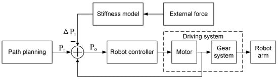 The second approach is to compensate for deformation during processing with a static stiffness model. The principle of compensation control is shown in Figure 2. First, an external force is acquired and transformed with sensors installed on industrial robots. When combined with the transformed data and joint angles directly acquired from the robot system, the stiffness model outputs the deformation after calculation to calibrate the robot [23]. In general, robot stiffness parameters are not provided by the manufacturers of industrial robots. For this reason, a stiffness model must be developed using dedicated experimental research [42].