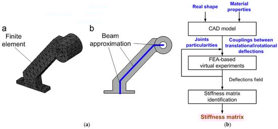 Stiffness identification with FEA [59]: (a) CAD model of a link with a complex shape and (b) algorithm for the stiffness matrix identification procedure.