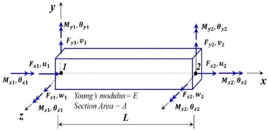Clinton et al. used the MSA method to model the stiffness of the Stewart parallel robot for the first time. Two assumptions were made in the experiments. First, the connecting links of the robot were only subjected to tensile deformation without bending. The second was that the stiffness of the robot frame was much stronger than that of the connecting link. The experimental results demonstrated the effectiveness of the MSA method for stiffness modelling [93]. For further study, Goncalves et al. first obtained the stiffness matrix of a 6-RSS parallel robot by considering the stiffness characteristics of elements such as the connecting links, actuators, and joints. Additionally, the stiffness of the joints and brakes were ignored by this simplified model [21]. To investigate the influence of joint stiffness, Deblaise et al. established two PKM stiffness models based on MSA. The first model assumed that the robot’s joints were rigid and only considered the deformation of the connecting links, while the second model considered the deformation of both the robot’s connecting links and joints. Load experiments showed that the second model was closer to the true elastic deformation of the robot [63]. Azulay et al. also considered the flexibility of the robot’s connecting links and joints. The MSA method was applied to derive a high-precision static stiffness model of a 9-DOF redundant and reconfigurable 3 × PPPRS parallel mechanism [91]. Based on the assumption of 12 DOFs for each link (Figure 5), Shi et al. proposed an MSA model of a complex EAST Articulated Maintenance Arm (EAMA). The model matrix was simplified based on boundary constraints. Compared with the FEA method, the prediction error of this method was less than 5%, which is within the acceptable prediction error range, and the computational efficiency was improved [87].