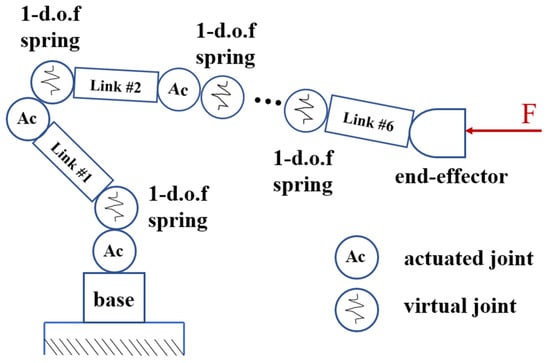 The traditional VJM method first defines each joint of a robot as a virtual spring and assumes that the connecting link has no deformation (Figure 7). It establishes a rotational stiffness matrix for the robot joint space. The Cartesian stiffness is calculated based on the transformation of the kinematic Jacobian matrix . The mapping relation of the stiffness matrix in Cartesian space to joint space (3) was first proposed by Salisbury [68] and has been applied in the industry [42,72,90].