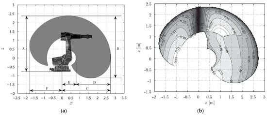 Distribution of the inverse condition number in the Cartesian workspace of a KUKA robot [109]: (a) Cartesian workspace of the KUKA KR240−2 robot and (b) contours of the inverse condition number of .