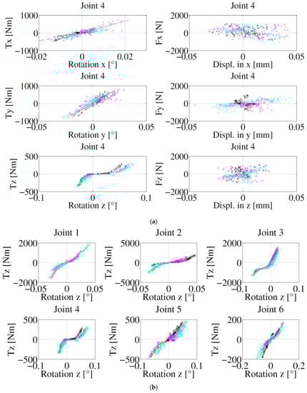 Schneider et al. identified the stiffness of the six DOFs of industrial robot joints and displayed the nonlinear characteristics of the joint. First, force and torque sensors were installed on the end flange of the robot. Wrenches on the robot EE were measured from the maximum load in the negative direction to the maximum load in the positive direction. An optical measurement system was used to detect the 6-DOF deformation of each joint in the loaded and unloaded states. The distribution diagram of the rotational stiffness of joint four based on the measurements of four different positions and postures is shown in Figure 10a. The stiffness identification results demonstrated that (i) the amplitude of the displacement deformation in the X, Y, and Z directions was within the measured noise range, and there was no clear trend change; and (ii) the joint deformation was mainly rotation angle deformation. The torques in the X- and Y-directions had linear relationships with the torsional deformation in the X- and Y-directions, while the torque in the Z-direction had an approximate cubic relationship with the torsional deformation in the Z-direction. The rotational stiffness of the six joints is shown in Figure 10b. Therefore, the nonlinear least squares method was used to fit the rotational stiffness data and establish a stiffness model. Through static wrench loading, the position of the robot EE in the Cartesian coordinate system was measured. The error between the predicted value and the measured value based on the stiffness model was less than 36%. Moreover, there was no model compensation delay. To better verify the performance of the model, a machining experiment was carried out to mill a circle with a diameter of 70 mm on a steel workpiece. Comparing the milling performance with and without stiffness compensation, the absolute average position deviation was reduced from 0.39 mm to 0.2 mm [117,118].