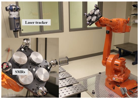 The laser tracker is most commonly used for tracking the robot’s EE position. It projects a laser beam onto an optical target that is in contact with an object to be measured and determines the three-dimensional position of the target. The optical targets, known as spherically mounted retroreflectors (SMRs), reflect the laser beam to its emitted origin point. As shown in Figure 13, an EE was built to hold three SMRs, which were tracked by a FARO laser tracker. Each SMR’s three translational position coordinates referring to the laser tracker coordinate system were recorded. If a six-dimensional (three translational positions plus three rotational angles) pose needed to be measured, at least three SMRs were required to form the six-dimensional pose [109]. The layout of the SMRs on the EE should be considered when the robot moves to the planned poses, which could hinder the laser beam reflecting from SMRs. To ensure that the SMRs were in the range of the laser tracker, offline simulation was needed to plan the location of the laser tracker and the robot poses. In addition, more than three SMRs could be mounted on the EE to ensure that at least three SMRs could be tracked at arbitrary poses. As shown in Figure 14, four SMRs were symmetrically located on a square plate for position tracking. The laser tracker manufacturer also supplied a six-dimensional position tracking device, such as a Leica T-Mac (Leica, Wetzlar, Germany) [124]. Depending on the distance between the SMRs and laser tracker, the absolute measuring accuracy reached 10 µm.