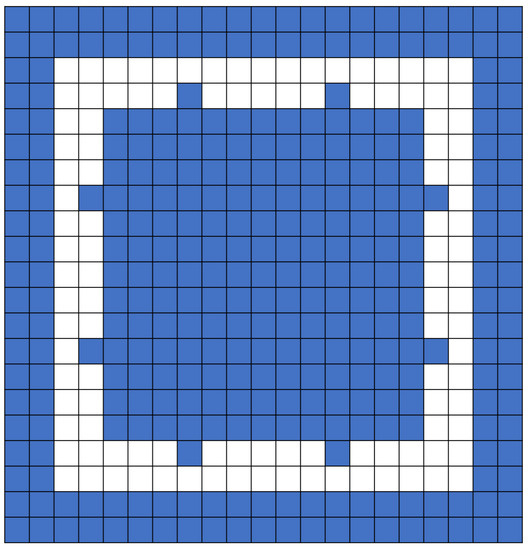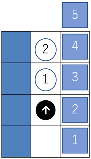 An agent can observe two squares in front and to the left and right and one square behind (Figure 2). There are four types of states for each square that an agent can distinguish: empty, wall, clockwise agent, and counterclockwise agent. Agents have four directions, but it is impossible to observe which direction each agent in the field of view is facing. In addition, to determine which way to go along the path, the agents are given information about whether they are on the inside or the outside of the path.