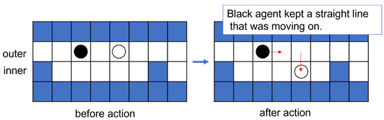 Since all walls that made up the narrow place were located on the inner side, continuing to move on the outer side was more rewarding. Therefore, we conducted a preliminary interpersonal experiment on collision avoidance with an agent that learned to give way when it was on the outer side of the path. However, as described later in Section 4.2, the scenes shown to subjects were relocated to later scenes in a short number of steps. So, there was a problem in that the subjects did not feel that the agents’ actions—as they were assumed to be circling for a long time—were giving way to them. Thus, in this experiment, the agents were set as having given way when they kept the inside or outside position before and after passing each other (Figure 3).