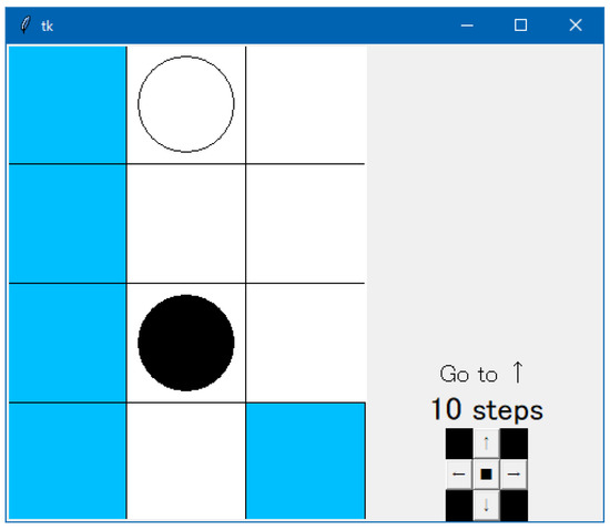 The subjects manipulated the agent by using an application, the interface of which is shown in Figure 4. The left part of the experimental application (Figure 4) showed the state around the subject-operated agent. The corridor walls are represented by blue squares, the agents operated by the subject are represented by black circles, and the agents operated by the computer are represented by white circles. As an example, Figure 4 shows a subject agent passing through a narrow place while adjacent to a computer agent. The computer agent is given information on whether it is on the inside or outside of the corridor to help it decide which direction to go. To make it easier for the subject to decide where to stand, an arrow on the right side of the screen indicates which direction to go around a corridor.