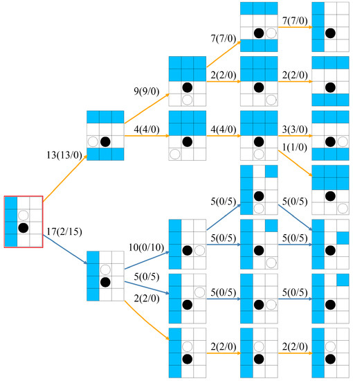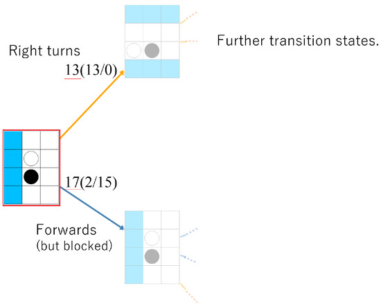 The state in which a subject took two or more actions was marked as a state in which the strategy change was apparent, and the score was set to 1 when the first step after relocation was marked. As an example, Figure 6 shows a state transition in which a subject’s action selections in Step 1 after relocation were multiple selections: a right turn 13 times and forward movement 17 times. Therefore, a state node after the relocation was marked, and the score of the state transition was set to 1. In the case of an unmarked state, the following transition was verified. Early and stable transitions were assumed to show more confidence in subjects’ strategy changes in response to changes in agents’ strategies. So, each step was multiplied by 0.8, and the weights corresponding to the number of transitions were multiplied. When there was no next step recorded, the score was set to 0.