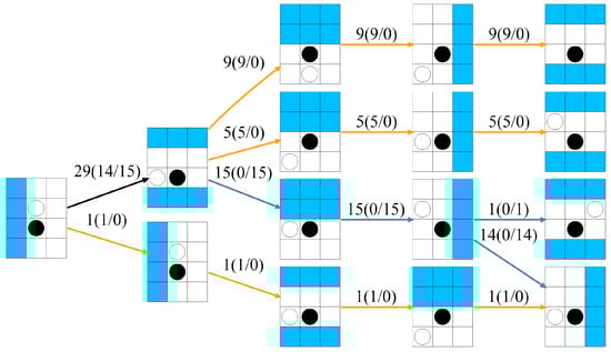 Figure 7 and Figure 8 show the state transitions for Subjects 1 and 7, starting from where the subject agents were placed at the adjacent state up until the fifth step. From the left state, the steps transitioned to the right states one step at a time, following the arrows on the edges. The three numbers on the edges indicate the total number of transitions, the number of transitions when a computer agent had an active strategy, and the number of transitions when a computer agent had a passive strategy. If the agent’s share of either strategy (active or passive) exceeded 80% of the total transitions, the edge was colored orange for the active strategy and blue for the passive strategy.