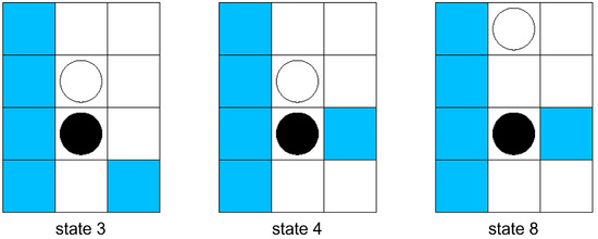 The subject was also in a narrow place in state 8, one unit away from the computer agent. In this situation, the computer agent with a passive strategy moved forward, adjacent to the subject agent, and then tried to move to the side. If the computer and the subject agent tried to move forward simultaneously, the order of their actions was randomly determined, and if the computer agent acted first, it would be in state 4. Therefore, when starting from state 8, subjects lost a chance to measure their action change as if they had started from state 4 for about half of the time, depending on the random number of action orders.