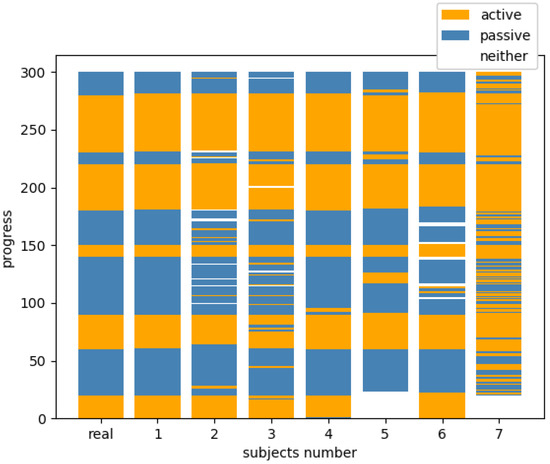 Actually, in Figure 10, we can see that the strategy estimations of Subjects 1 and 4 were mainly correct. Subjects 2, 3, and 5 also made generally correct estimations. Subject 7’s strategy estimation was incorrect in many moments, especially when an agent taking a passive strategy was mistakenly thought to be taking an active strategy. In particular, Figure 11 and Figure 15 show that Subjects 1 and 7 had almost similar scores in the second half of the first trial (plotted in orange) and in the second trial (plotted in green). The action decisions and strategy estimations of the opponent agent were considered to have reached a certain degree at the time of the first trial. The estimation of the opponent’s strategy was also expected to have been close to that in the second trial, which is shown in Figure 10.