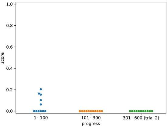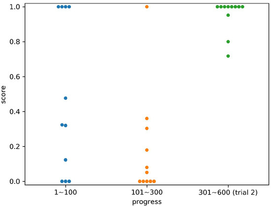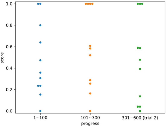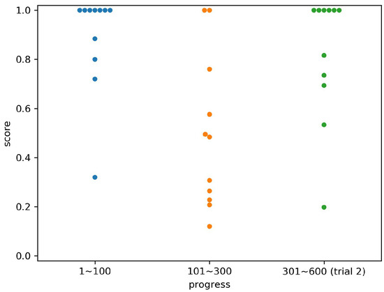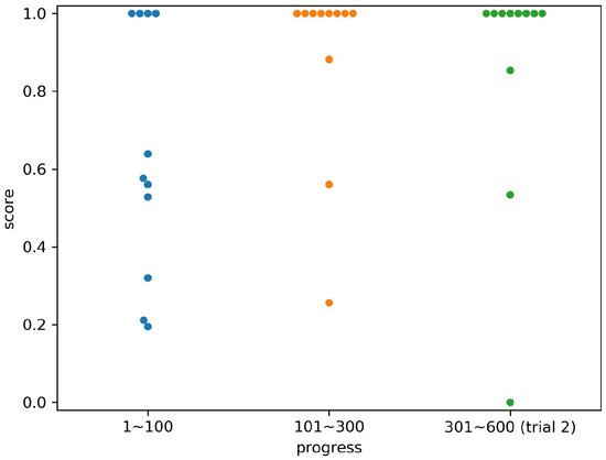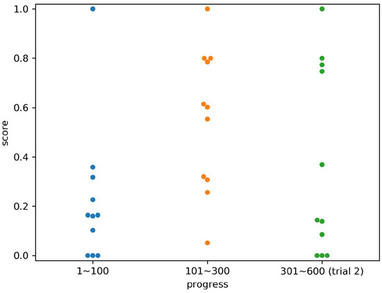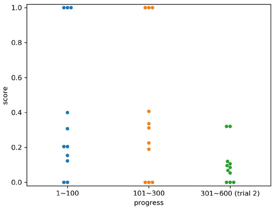 Figure 11, Figure 12, Figure 13, Figure 14, Figure 15, Figure 16 and Figure 17 show the scores for each subject by the time period, corresponding to the progress of the experiments. The periods were divided into the first 100 relocations, the second 200 relocations, and the entire second trial (300 relocations). In each period, the number of times that an opponent computer agent took two strategies was the same. For example, the values in columns 301 to 600 in Figure 14 are the scores in the column of Subject 4 in Table 1. Subject 4 scored 1.0 for the hree states 2, 3, and 7, so three points were plotted at the height of 1.0 in the right column of Figure 14.