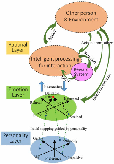 A model of an interaction strategy from a previous study [6] was considered, as shown in Figure 18. Individuals have a fixed personality layer as a base. On top of this, there is an emotional layer, including the dynamics of mental states during communication with others; this are expressed along axes such as interest and strain. Mental states change over time through interactions. It is expected that maintaining good mental states enables intelligent information processing (strategy selection) in communication in response to the approaches of others, as well as good interactions with agents.