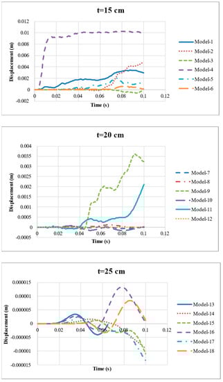 - Considering the weight of TNT used in a short distance (R = 2 m), it was observed that very large local stresses were created in the wall, which caused the wall to collapse in a very short time. It should be noted that at distances of less than 2 m, the wall models diverged at the very first moments. Therefore, the analysis and presentation of their results were avoided here.