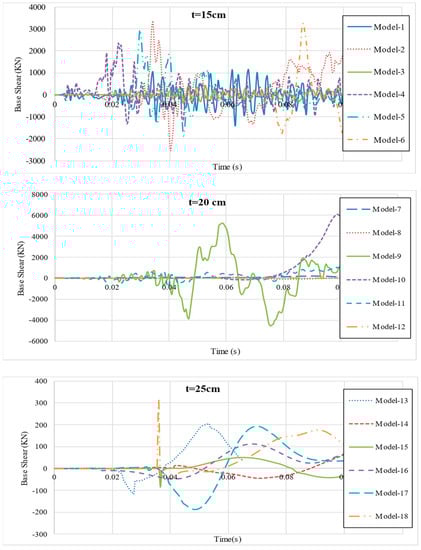 - The thickness of the walls was very effective in reducing the explosive demand force. For example, for a wall with a thickness of 15 cm, compared to that with a thickness of 25 cm, the base shear values induced by the same explosion were about 10 times higher.